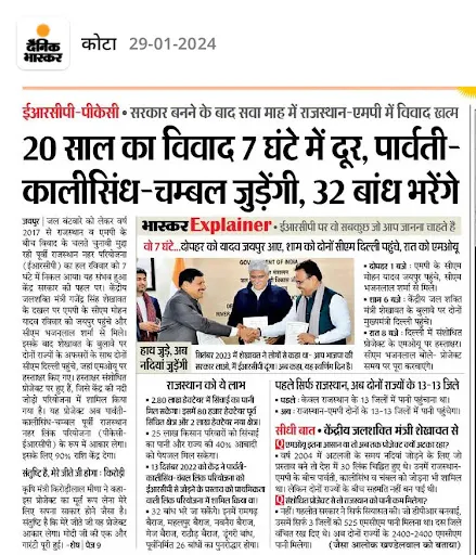 ERCP को लेकर राजस्थान-मध्य प्रदेश में MOU साइन:पानी के बंटवारे पर बनी सहमति; पूर्वी राजस्थान और मप्र के चंबल-मालवा को मिलेगा फायदा1- पूर्वी राजस्थान नहर परियोजना (ERCP) में पानी के बंटवारे को लेकर राजस्थान और मध्य प्रदेश के बीच समझौता हो गया। दिल्ली में केंद्रीय जलशक्ति मंत्री गजेंद्र सिंह शेखावत की मौजूदगी में राजस्थान के सीएम भजनलाल शर्मा और मध्य प्रदेश के मुख्यमंत्री डॉ. मोहन यादव ने MOU साइन किया। रविवार शाम करीब साढ़े सात बजे दोनों सरकारों के बीच पार्वती-कालीसिंध-चंबल रिवर लिंक परियोजना पर सहमति बनी। अब चंबल, पार्वती और कालीसिंध नदी को जोड़कर बड़ी आबादी तक पानी पहुंचाने का सपना साकार होगा। राजस्थान और मध्य प्रदेश के कुल 26 जिलों को इसका सीधा लाभ मिलेगा। इस हेतु कई डेम बनेंगे, कई डेमो का जीर्णोद्धार भी होगा और नहरें बनेंगी।