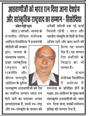 संभाग संयोजक सिसोदिया नें अयोध्या में रामलला के प्रतिष्ठित होनें के पश्चात, इस आंदोलन के मुख्य कर्ता लालकृष्ण अडवाणीजी को " भारत रत्न " दिया जाना, उनकी सर्वमान्य प्रतिष्ठा को सम्मान देना है, जिसका भारत के सभी नागरिकों नें स्वागत किया है। आडवाणी जी इसके हकदार हैँ। इसके लिए प्रधानमंत्री मोदीजी एवं भाजपा सरकार साधुवाद की पात्र हैँ। पूरा देश मोदीजी का आभारी है।